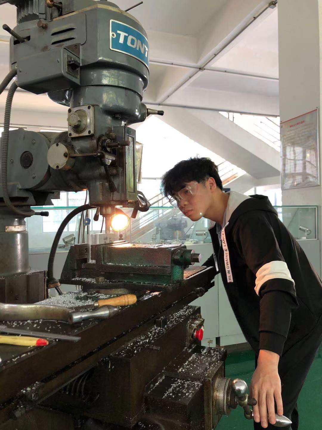 近日,2020级模具设计与制造学生们正走入校内实训车间,英国365集团官网谭杰文、彭伟老师带领大家开启了模具专业基本技能训练《铣床加工铝合金装配件》项目训练。同学们拿起一块块铝锭模具,在铣床上依照设计图稿进行加工,其中有一位名叫覃承凯的学生,因为加工手法娴熟,操作规范,不禁让人眼前一亮。