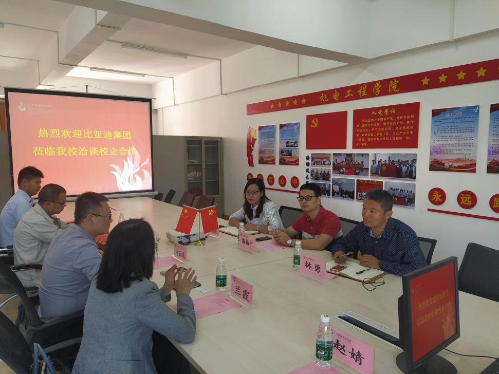 26日下午,比亚迪股份有限公司许云龙经理一行到我校进行校企合作交流。英国365集团官网就业创业指导中心主任潘福中,英国365集团官网副院长林勇、李奕萍,英国365集团官网就业专员黄发宜等在建工机电楼305A会议室热情接待了来宾。