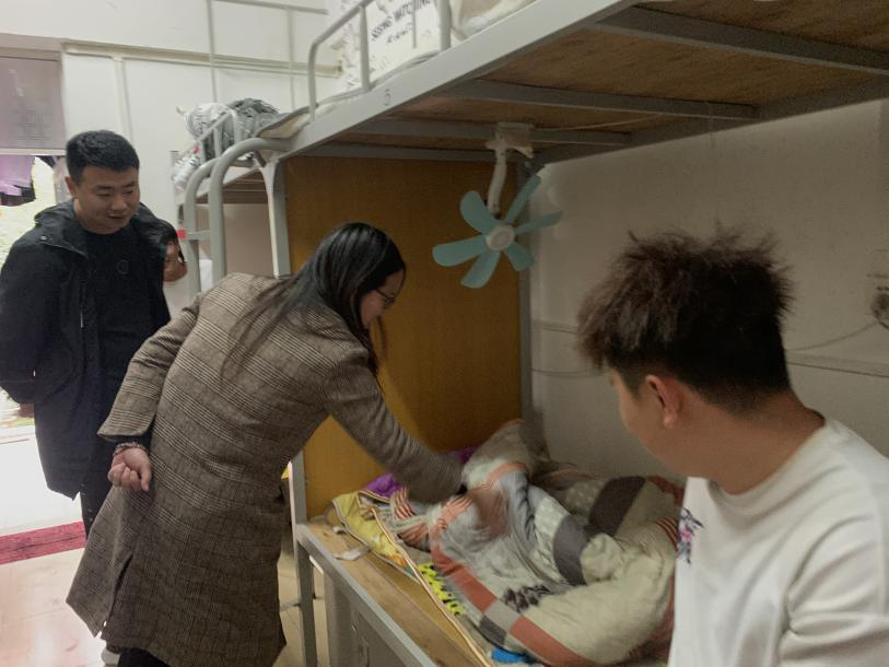 本次宿舍卫生检查是未提前通知的,在同学们没准备的情况下,先从19栋2楼开始,对学生宿舍逐间地走访检查,特别关注窗户积尘、阳台积水、衣物摆放、宿舍垃圾清理等问题。经检查发现,大部分宿舍卫生状况较好,基本做到了勤开窗多通风,勤卫生大扫除,宿舍内地面、桌面干净整洁,被褥衣物叠放整齐,其余生活用品摆放整齐有序。但是,发现个别宿舍内部封闭不通风,空气质量较差,或床铺不整洁,桌面上的物品摆放杂乱,地面拖鞋摆放混乱,卫生间地面较为脏乱等。针对宿舍卫生较差的,当时就及时指正并教育,督促其改正问题,改善了宿舍环境。另外,李副院长提醒同学们近日要关注天气变化,及时增减衣服,注意防寒保暖,同时要做好个人防护,预防流行病。