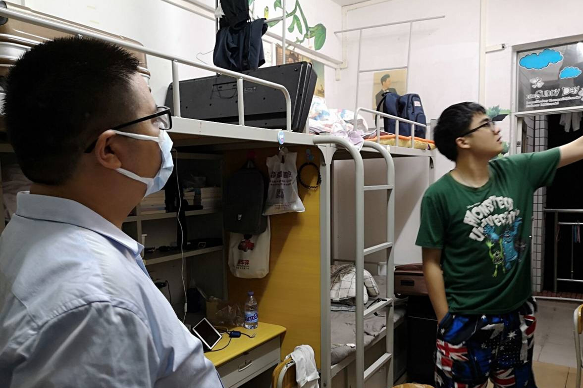 林勇副院长首先来到17栋学生宿舍楼走访。他们叮嘱学生在特殊时期要勤洗手,不要互相串门,自觉做好体温测量,出门全程佩戴口罩,就餐注意安全距离,每日做好宿舍的开窗通风、卫生清洁、消毒杀菌等工作。李有兵副院长询问学生的线上网课体验,鼓励学生在宿舍开展自主学习,希望学生合理安排疫情防控期间的学习时间。李奕萍副院长关心学生的身体健康状况,询问学生的返校状态,了解学生在学习及生活上遇到的困难,并对宿舍内的卫生清洁、床铺整理、物品摆放等进行了相关的指导。