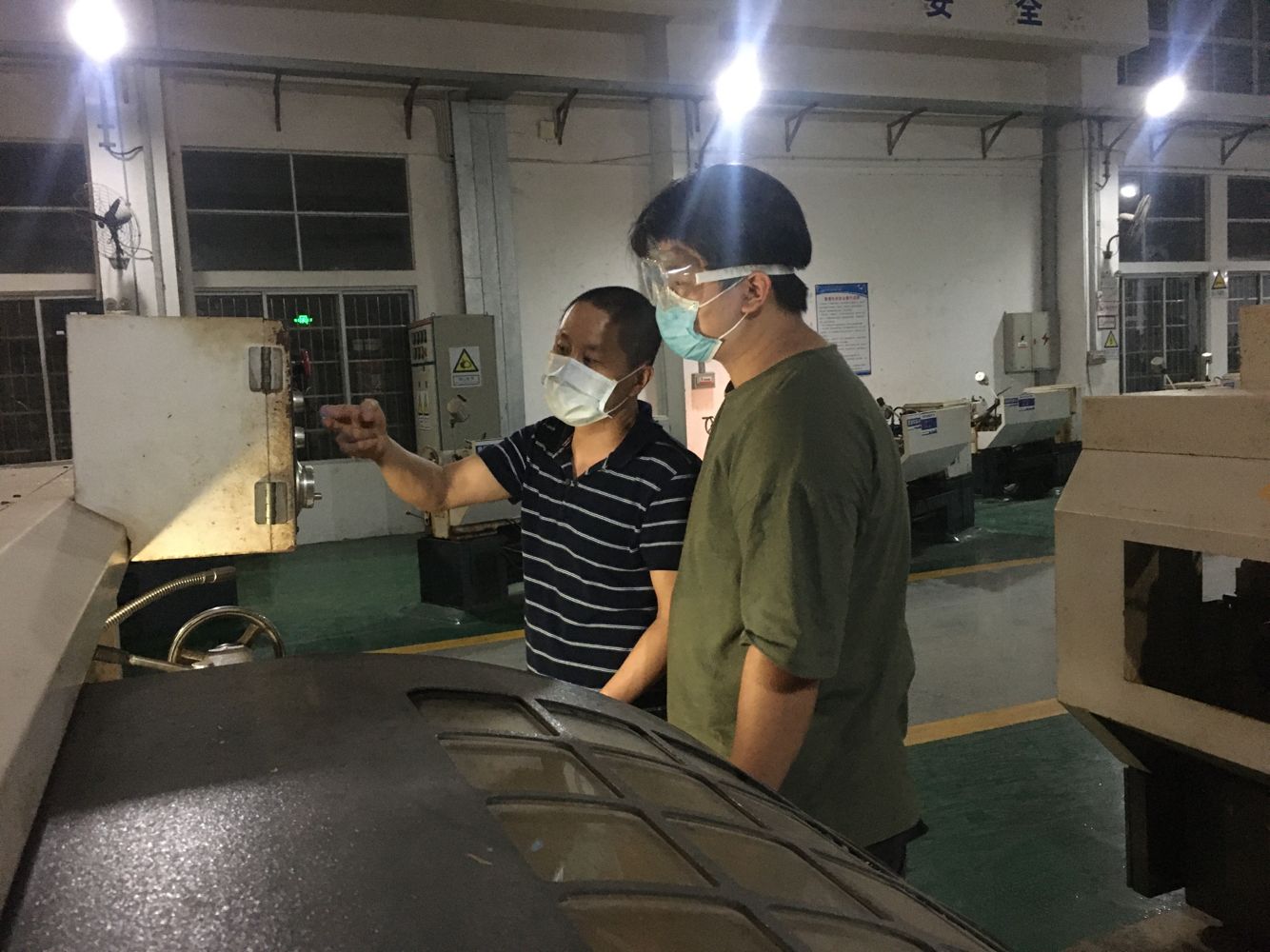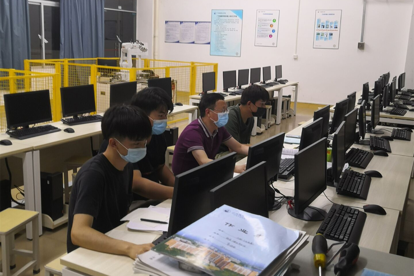 自备赛工作启动以来,在每天高达10小时的训练中,所有指导教师一直陪伴在选手身边悉心指导。在现代加工中心车间,手拿游标卡尺的老师正在指导学生加工产品,车间内弥漫着浓重的机油味,初夏的校园已被烈日炙烤得有些闷热了,但他顾不得停下来休息,手把手教学生实操技能。今年五一劳动节有五天长假,但为了在比赛中取得优异的成绩,师生们都放弃休假,在学校刻苦备赛。