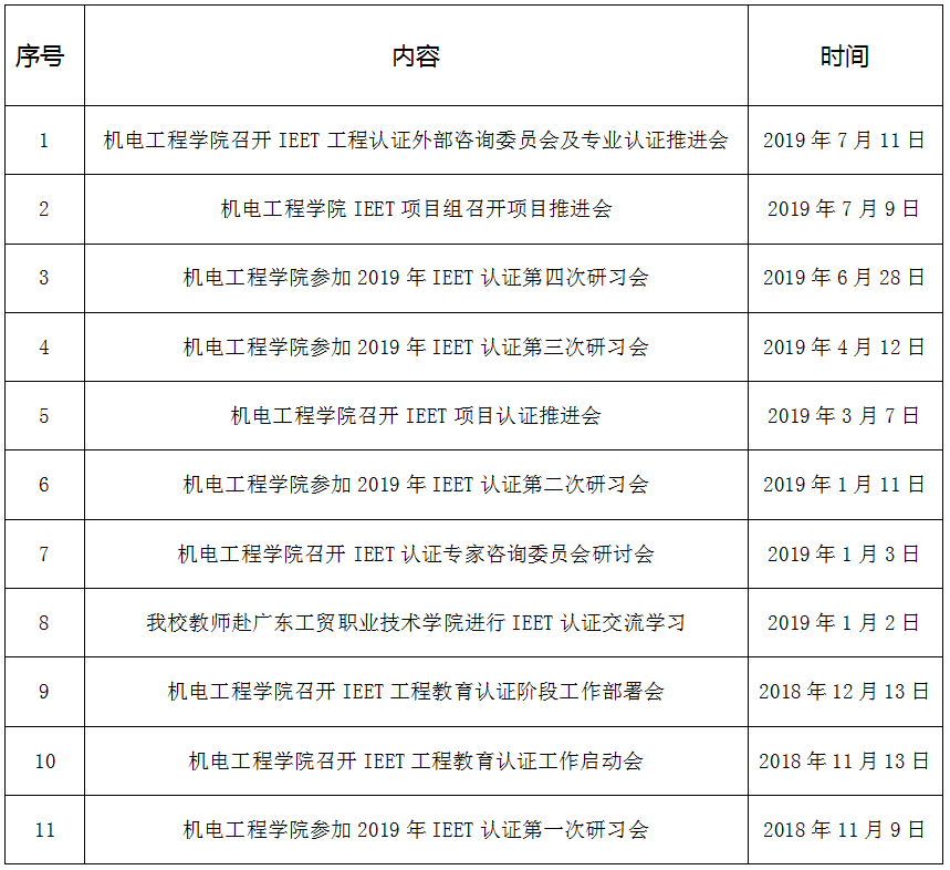 2018年11月9日,教务处长鄢维峰、副处长唐玉群,时任英国365集团官网院长林勇、副院长李有兵、教研室主任曾一新等5人参加2019年IEET工程及科技教育认证研习会首次培训,由此拉开了IEET专业认证的序幕。