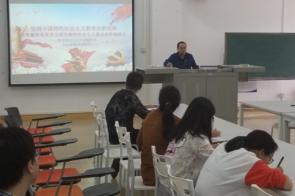 会上,欧志勇书记以“坚持中国特色社会主义教育发展道路,培养德智体美劳全面发展的社会主义建设者和接班人”为主题传达习近平总书记在全国教育大会上的重要讲话精神,其中主要从指出新形势下党的教育方针、高度评价教师贡献和地位、阐明教育事业的当代意义等十三个方面进行解读。他强调,我们要认真学习贯彻习近平全国教育大会重要讲话精神,把立德树人融入到教育教学环节当中,严格要求和完善自己,要执着于教书育人,有热爱教育的定力、淡泊名利的坚守,积极培养培养德智体美劳全面发展的社会主义建设者和接班人。