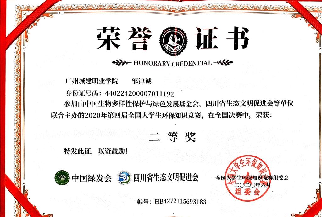 近日,全国大学生环保知识竞赛组委会发布了《2020年第四届全国大学生环保知识竞赛获奖名单》,365集团机电一体化专业学生邹津城同学喜获二等奖。