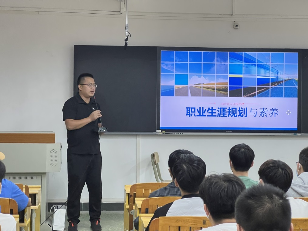 干志勇总监作为多所院校就业创业指导老师,熟悉人力资源六大模块,在职业的选择与素养、职业生涯规划、职场礼仪、职业心态等模块有丰富的指导经验。在培训中,干志勇以“培养爱岗敬业精神,放飞梦想扬帆起航”为主题,重点围绕职业形势、职业选择、职业精神、职业规划等四个方面展开讲解,既有当前就业形势的分析,又有具体的建议和指导,紧扣主题,利用现实的案例引人深思。随后,2020届优秀毕业生林楚滨围绕“爱岗敬业”这一主题,从身份转变的角度,利用亲身经历为同学们讲述在职场中培养敬业精神的重要性,提醒同学们在职场中要爱岗敬业,带着责任感工作,希望同学们到岗后尽快适应岗位培训。