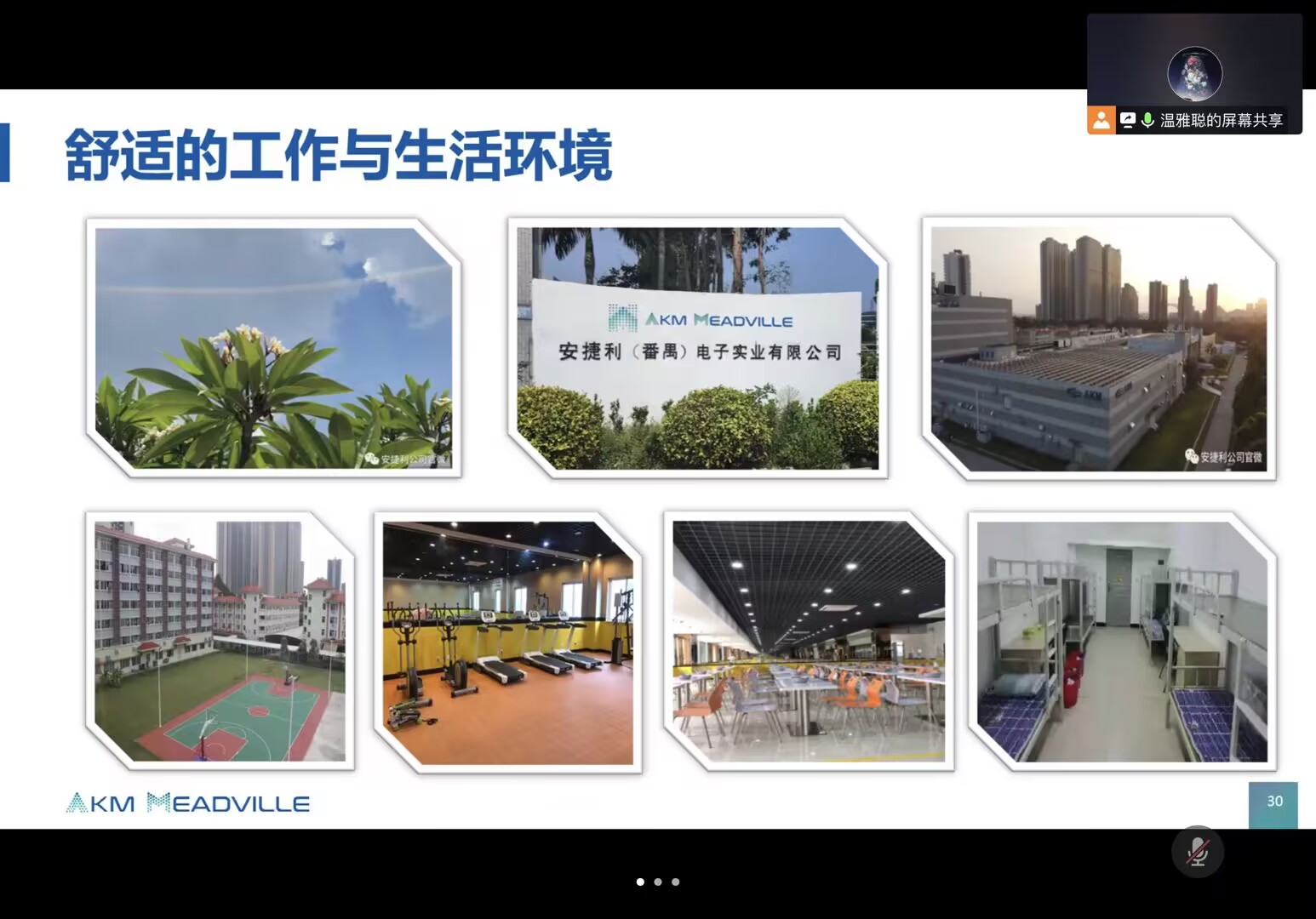 会上,专员温雅聪通过播放宣传片、PPT展示、线上交流等方式向同学们介绍了公司的概况、企业文化、职业发展方向、人才定位、福利待遇以及食宿环境等,此次计划招聘的岗位是储备干部和技术员。随后,在互动交流和答疑环节上,学生就工作岗位、福利待遇、食住行及上班时间等踊跃提问,专员温雅聪一一回答了学生提问。最后,专员温雅聪表示安捷利美维电子(厦门)有限责任公司欢迎同学们加入,希望同学们能踊跃投递简历。