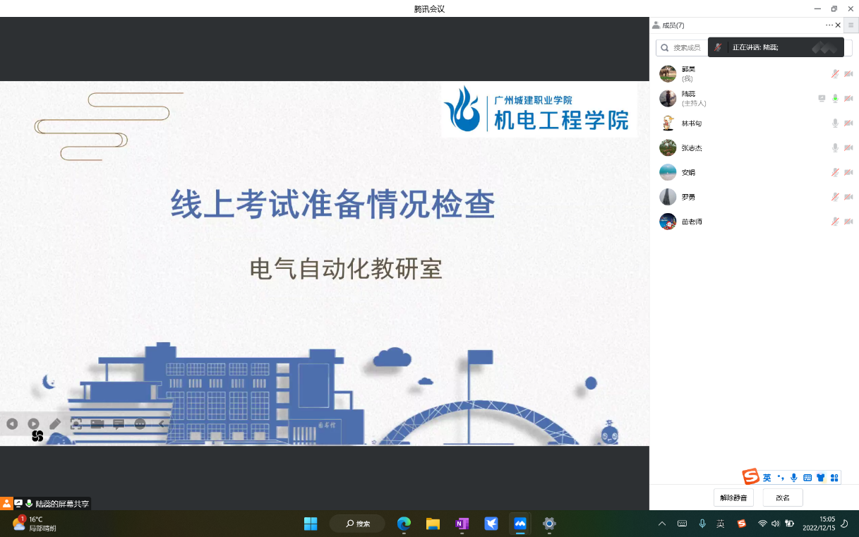 12月15日下午,电气自动化教研室通过腾讯会议的形式召开线上教学和考试工作专题会议。会议由教研室主任陆蕊主持,教研室全体老师参加了会议。