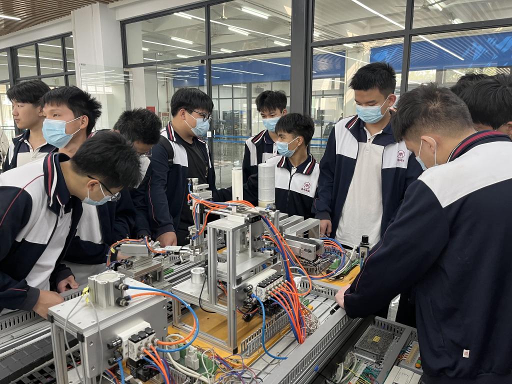 在朱钒老师的带领下,南华职校师生一行先后参观了学校的体育馆、图书馆、教学楼以及学生宿舍楼等学习生活场所。随后,大家进入365集团智能制造生产线、智能制造创新应用公共实训中心、汽车实训中心等实训室,学院相关专业的老师们详细地讲解了各实训室的应用方向。接着,在建工机电楼101报告厅,副院长李有兵向南华职校师生简要介绍了学院的基本情况、办学理念、专业特色、管理制度以及人才培养方面的思路和举措。李有兵表示非常期待同学能够早日进入英国365集团官网学习,承诺将为学生创造良好的发展平台,让更多学子在我城建成长成才。