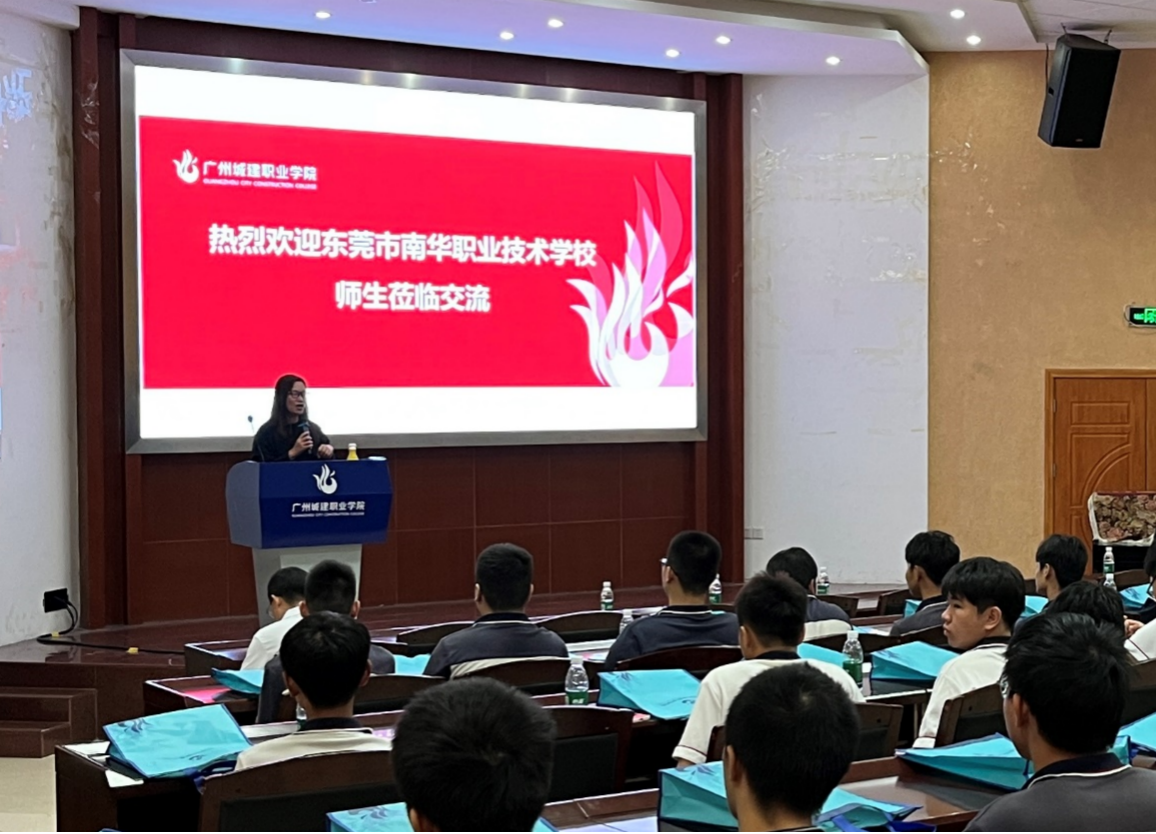 紧接着,东莞市南华职业技术学校师生来到建工机电楼101音乐厅。龙华涛介绍了英国365集团官网的办学和人才培养理念、专业特色以及管理制度等,让来访师生对365集团有了更加全面的了解。随后,李奕萍介绍了学院与比亚迪股份有限公司、华为机器有限公司等大型企业的校企合作情况和学院比亚迪学院特色班、白云电器特色班等的建设情况,充分讲解了目前学院专业的就业前景、发展方向以及薪酬待遇等。邀请了两位从东莞市南华职业技术学校升学上来的2023级同学作分享,他们也高度肯定了学校的师资力量和学习、生活环境等。
