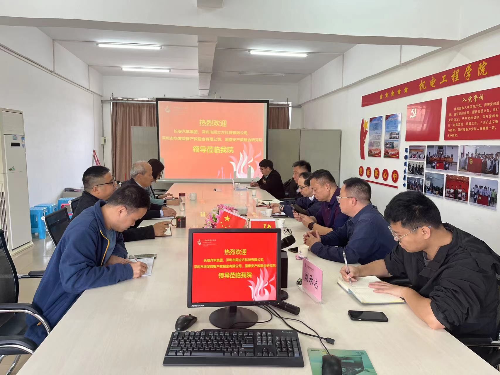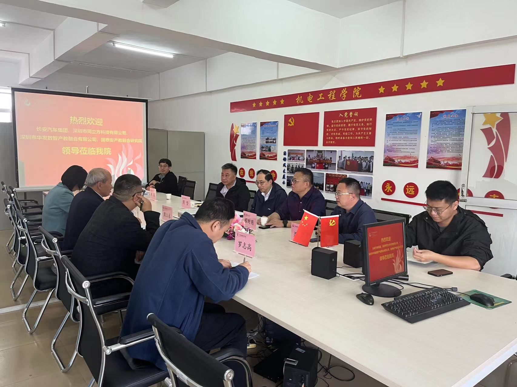3月20日上午,长安汽车集团、深圳市同立方科技有限公司、深圳市华发数智产教融合有限公司及国泰安产教融合研究院4家企业一行来访365集团洽谈校企合作,院长周立求及学院领导班子热情的接待来宾。