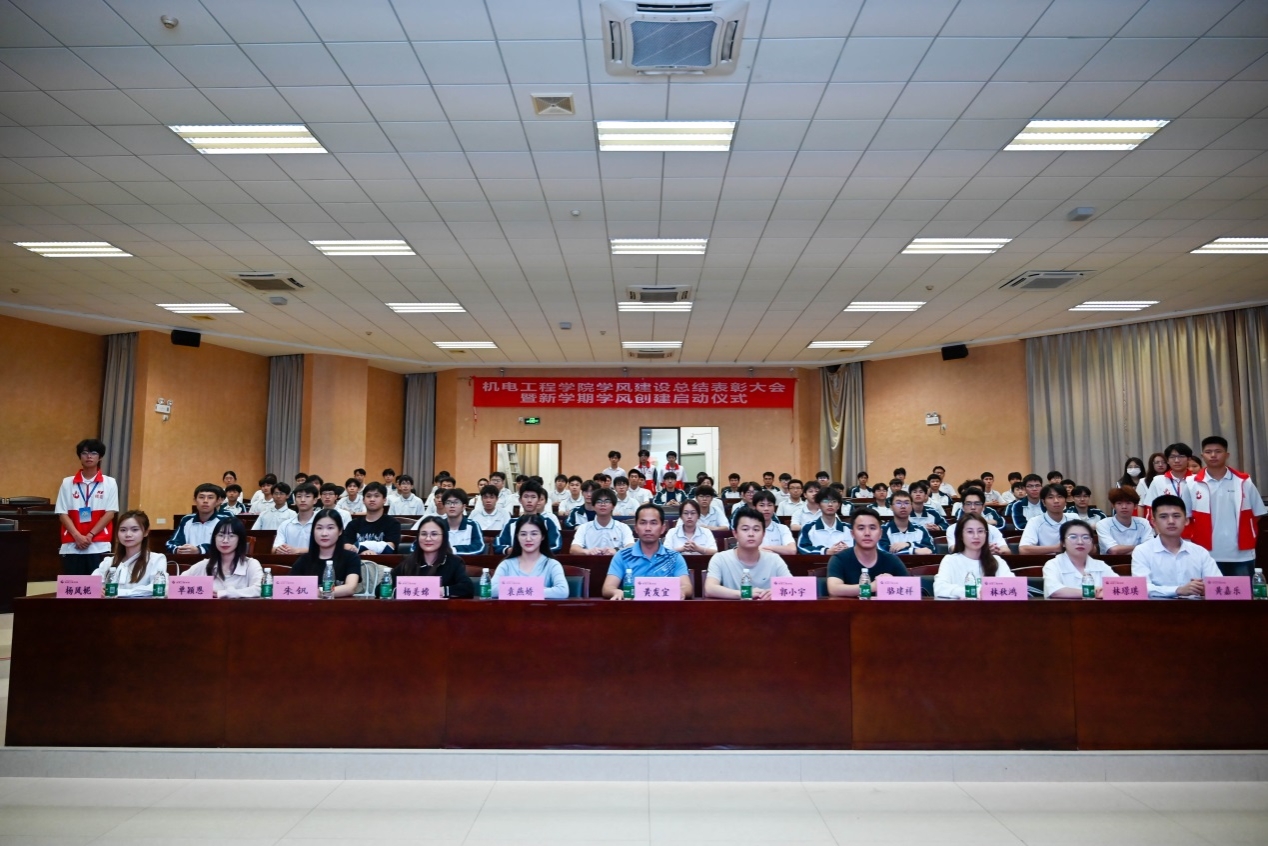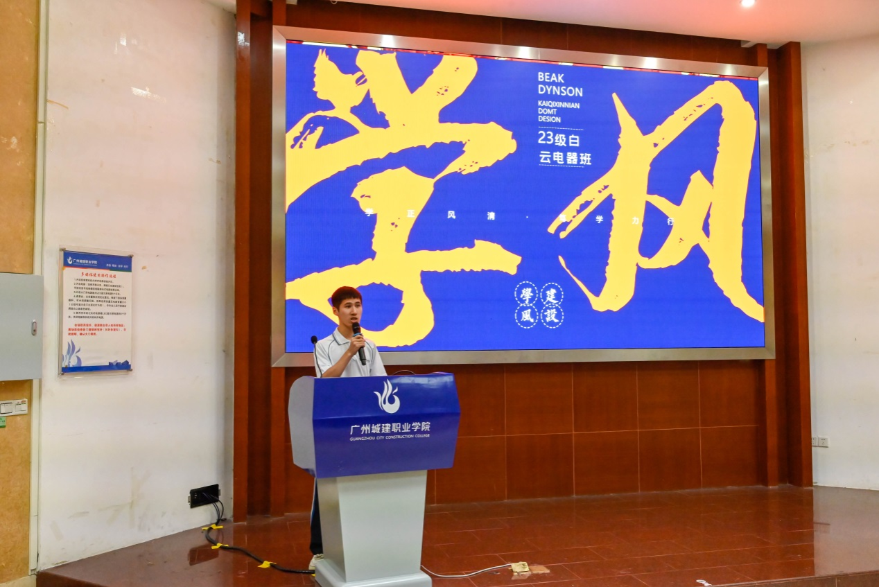 大会在奏唱团歌中拉开序幕。学院自律会会长冯胜蓝首先对上一学期学院学风建设工作开展情况进行总结,并汇报了新学期的工作开展计划。在分享环节中,班级学风建设先进个人代表叶木源围绕自身的大学经历,分享了成为学生干部后的成长蜕变故事;学风建设优秀工作者代表吴绍任对过去一学期的工作进行了总结,剖析问题并提出未来工作建议;先进班集体班干部代表古嘉涛以“学正风清,笃学力行”为主题,从立仁、立学、立风采及未来展望四个方面阐述了2023机电白云电器班在过去一学期班级学风建设过程中的经验做法。紧接着,大会进入颁奖环节,本次大会共颁发了四个奖项,表彰人次达271人,对上一学期在学风建设工作中表现突出的班级和个人给予了充分的肯定。