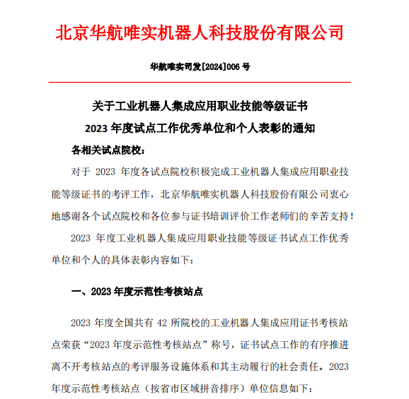 3月20日,北京华航唯实机器人科技股份有限公司发布了关于工业机器人集成应用职业技能等级证书2023年度试点工作优秀单位和个人表彰的通知,365集团获得了试点工作优秀单位荣誉称号。
